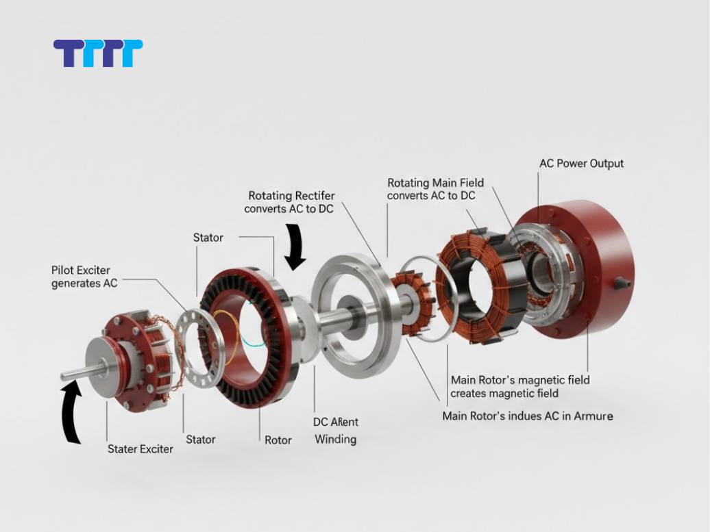 Khác biệt hoàn toàn với dòng truyền thống, củ phát điện không chổi than sử dụng hệ thống kích từ gián tiếp. Khi rotor quay, một bộ kích từ phụ tạo ra dòng điện xoay chiều, sau đó được chỉnh lưu thành dòng một chiều để cấp ngược trở lại rotor chính. Toàn bộ quá trình này diễn ra không cần tiếp xúc cơ học, loại bỏ hoàn toàn chổi than và vành trượt.