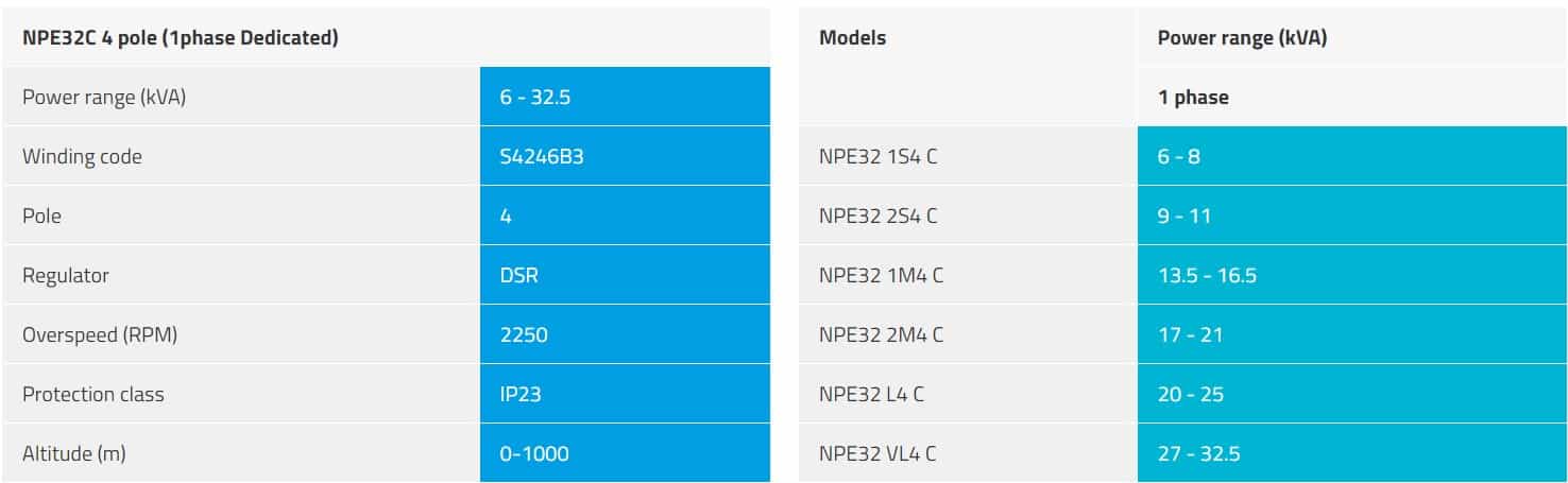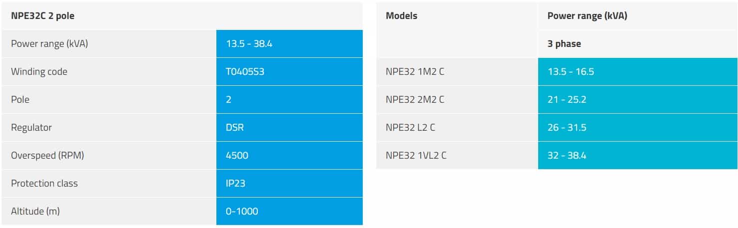 Mecc Alte NPE sử dụng tất cả các công nghệ tương tự như dòng ECO và ECP. Chúng không chổi than và được điều khiển bằng bộ điều chỉnh điện áp tự động DSR tiêu chuẩn và hệ thống MAUX nhưng đã được thiết kế nhỏ gọn nhất có thể. Phạm vi tiết kiệm không gian này được thực hiện càng nhỏ càng tốt để cho phép tác động không gian tối thiểu.