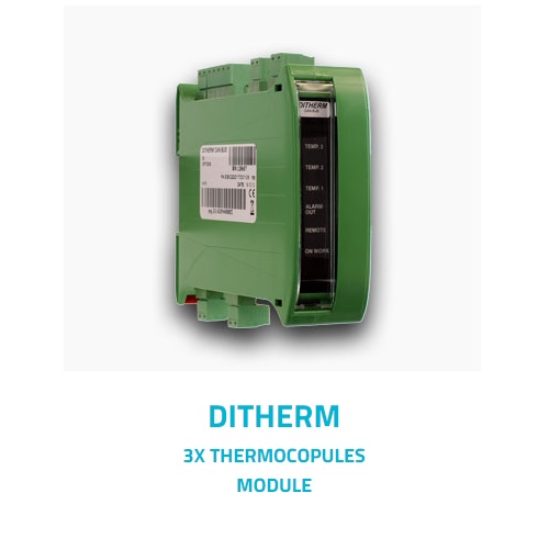 DITHERM là mô-đun cho phép kết nối hiện đại của các loại cặp nhiệt điện. Nó được trang bị ba kênh cách điện nhiệt độc lập. DIGRIN là mô-đun cho phép kết nối hiện đại của các loại điện trở nhiệt. Nó được trang bị ba kênh cách điện nhiệt độc lập.