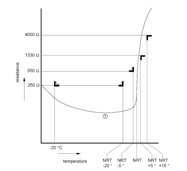 Hình ảnh dưới đây cung cấp đặc tính điện trở theo chức năng của nhiệt độ của các thiết bị này. Điện trở của từng cảm biến riêng lẻ (theo tiêu chuẩn), đối với nhiệt độ liên quan đến nhiệt độ đáp ứng định danh NRT, có các giá trị như sau: