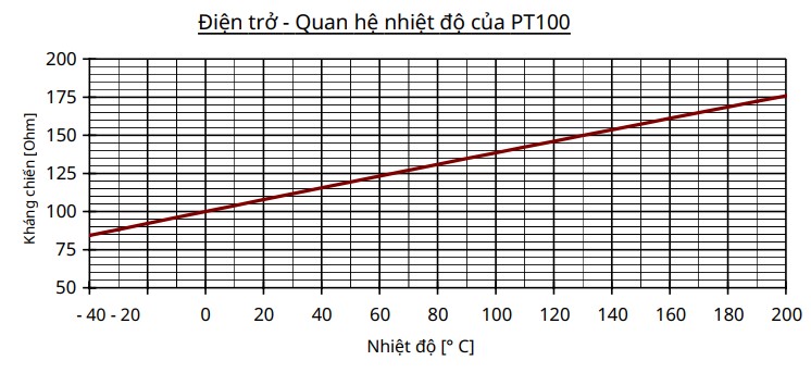 - PT100 là điện trở nhiệt meccalte của thiết bị này thay đổi tỷ lệ thuận với nhiệt độ của cuộn dây là điểm nó được lắp ráp (mối quan hệ của điện trở và nhiệt độ được đảm bảo trong phạm vi nhiệt độ từ – 50oC đến + 200oC). Một thiết bị như vậy thích hợp đo nhiệt độ của cuộn dây stato. Hình ảnh dưới đầy đưa ra mô tả bằng hình ảnh về mối quan hệ tuyến tính tồn tại giữa điện trở và nhiệt độ.